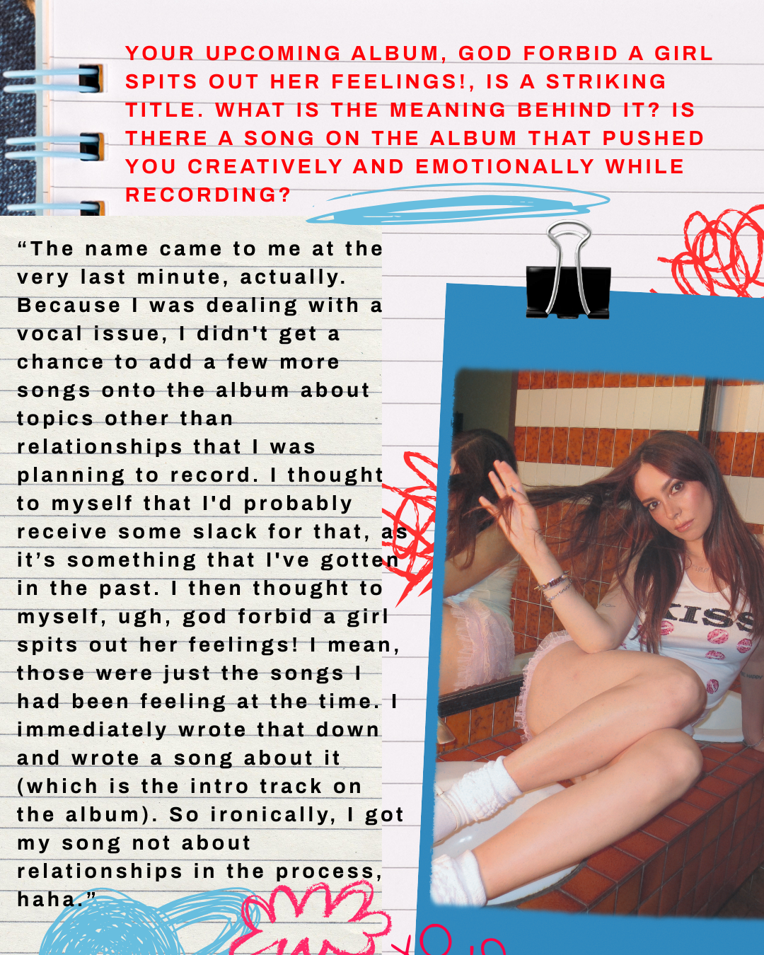 7. Your upcoming album, god forbid a girl spits out her feelings!, is a striking title. What is the meaning behind it? Is there a song on the album that pushed you creatively and emotionally while recording?