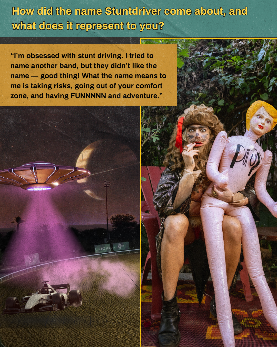 I’m obsessed with stunt driving. I tried to name another band, but they didn’t like the name — good thing! What the name means to me is taking risks, going out of your comfort zone, and having FUNNNNN and adventure.